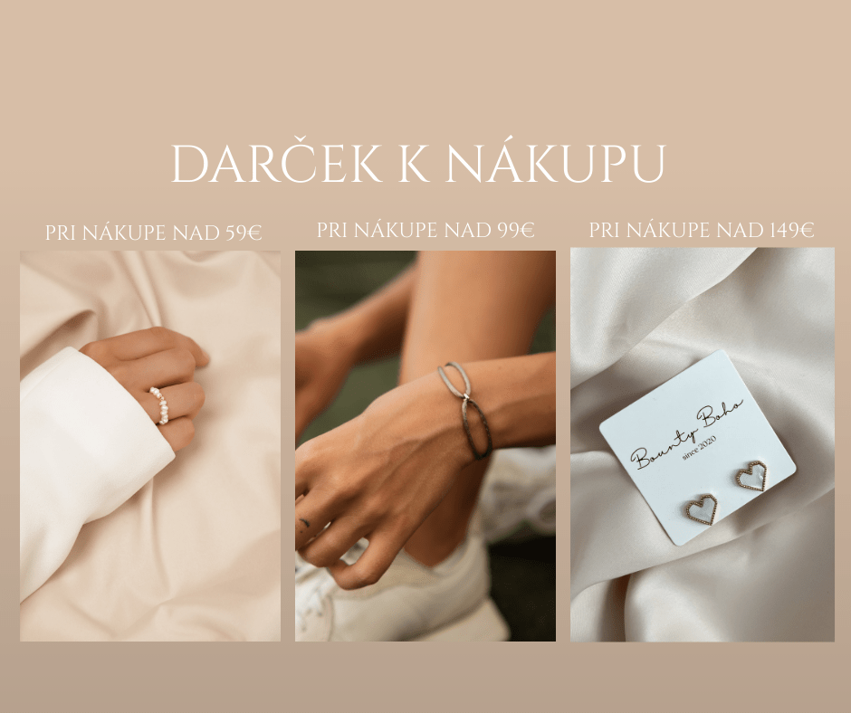 Pri nákupe nad 59€ bude na teba čakať v košíku prstienok z riečnych perál. Pri nákupe nad 99€ náramok Matcha. Pri nákupe nad 149€ získaš náušnice Heart Shell