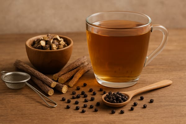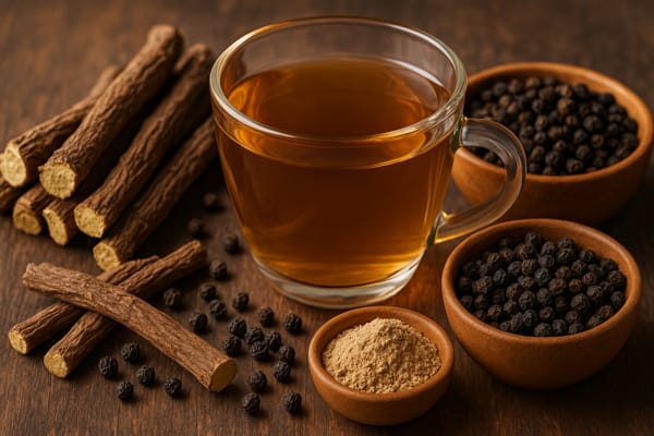 Podpora trávenia: Čierne korenie je známe ako silný stimulátor agni (tráviaceho ohňa). Povzbudzuje chuť do jedla, zlepšuje trávenie a pomáha pri nadúvaní či pocite ťažkosti. Má schopnosť tzv. „prerezávať“ a vysúšať nadmerné kaphické usadeniny, čím odbúrava toxíny (ama) v črevách. Sladké drievko naopak upokojuje podráždenú žalúdočnú sliznicu a vďaka svojej sladkej chuti zmierňuje nadmernú kyslosť – v ájurvéde sa používa pri pálení záhy, žalúdočných vredoch a zápaloch tráviaceho traktu. Spoločne tak korenie zlepší trávenie ťažších jedál a sladké drievko ochráni žalúdok pred nadmerným teplom a kyselinou. Čaj z tejto dvojice sa preto hodí po jedle pre lepšie trávenie.