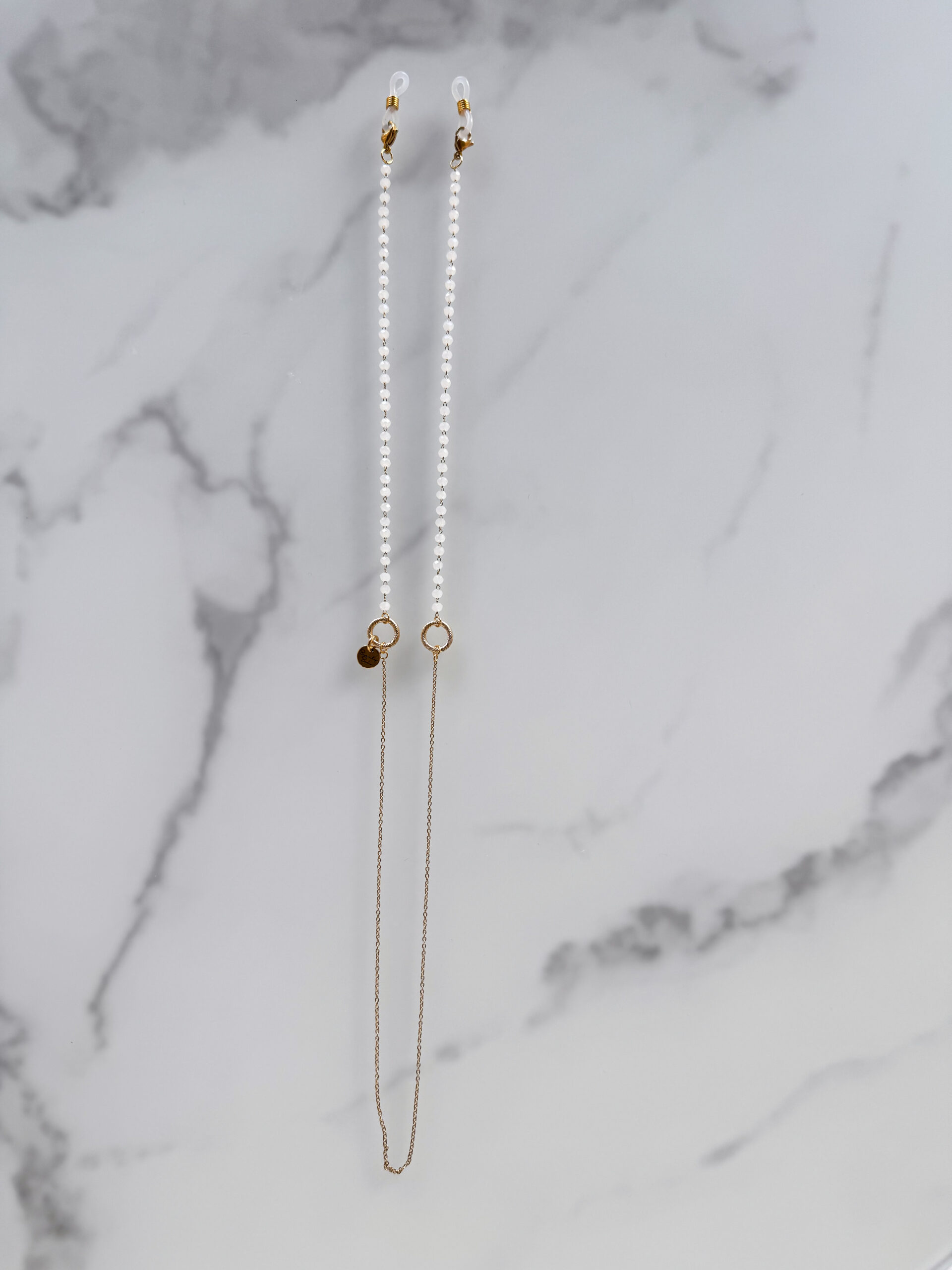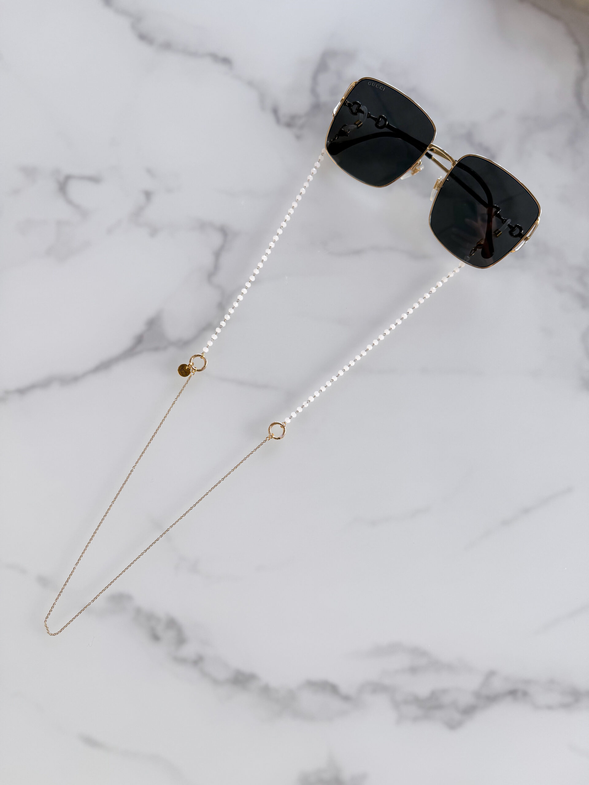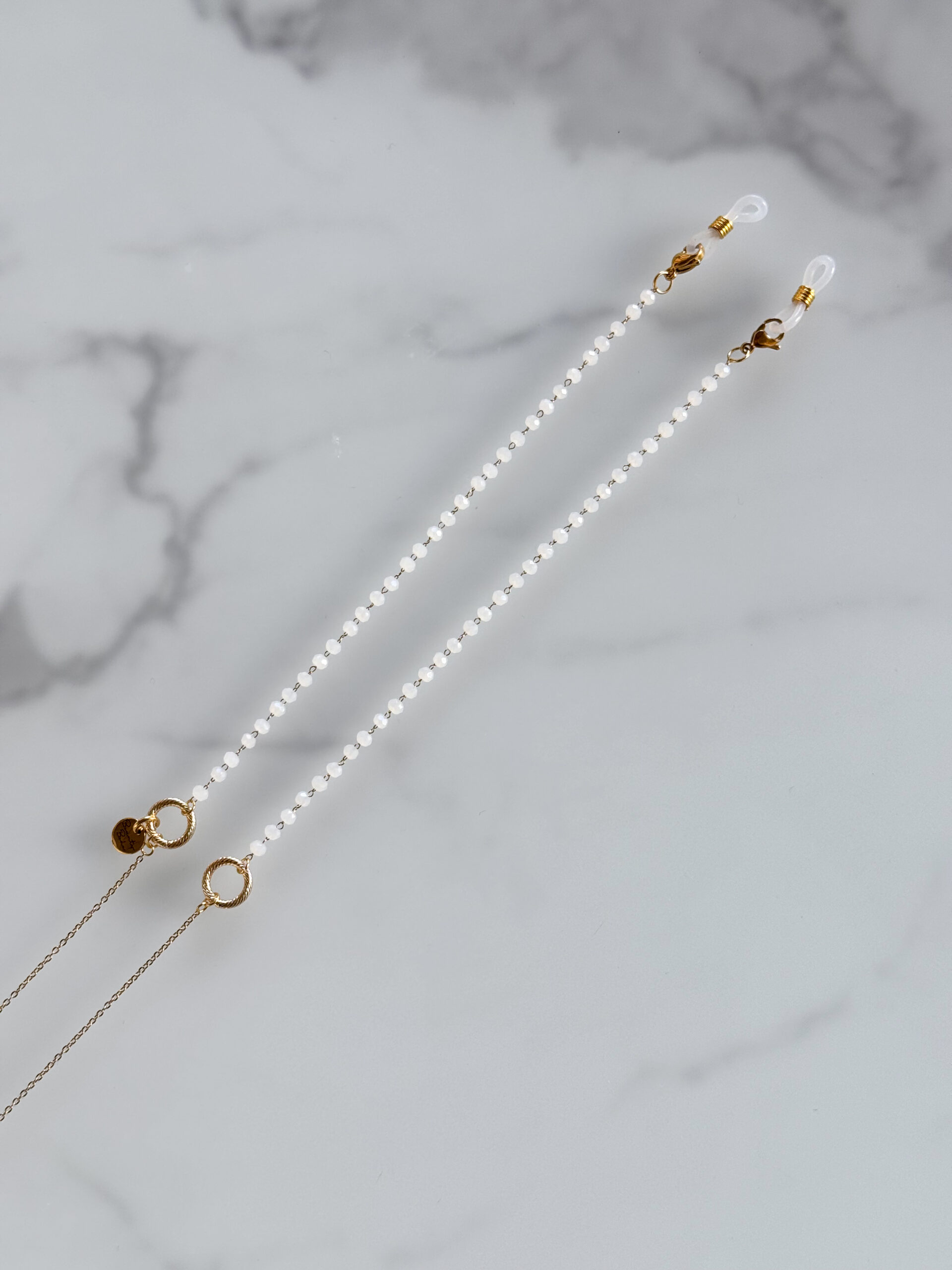 Minimalistická retiazka na okuliare z bielych kryštálikov a retiazky z chirurgickej ocele. Dĺžka retiazky je 75cm.