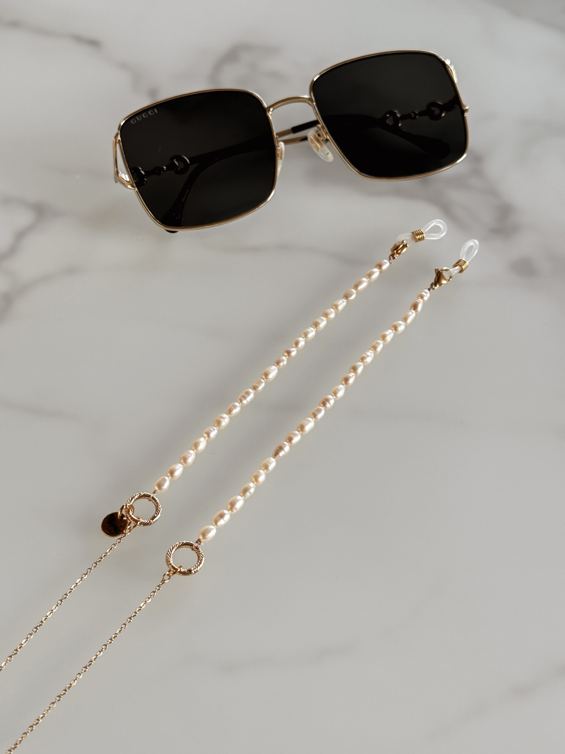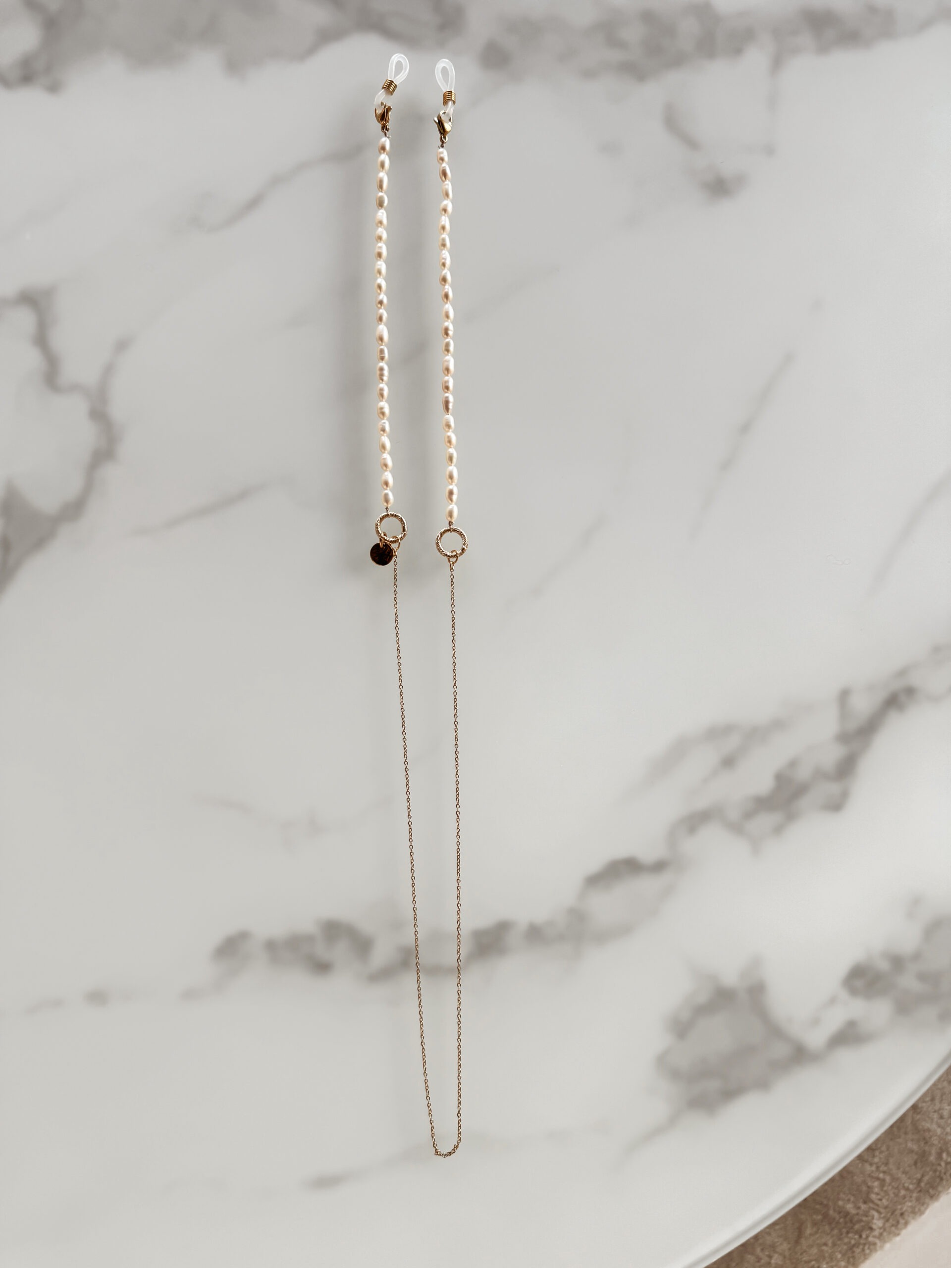 Minimalistická retiazka na okuliare z riečnych perál a retiazky z chirurgickej ocele. Dĺžka retiazky je 75cm.