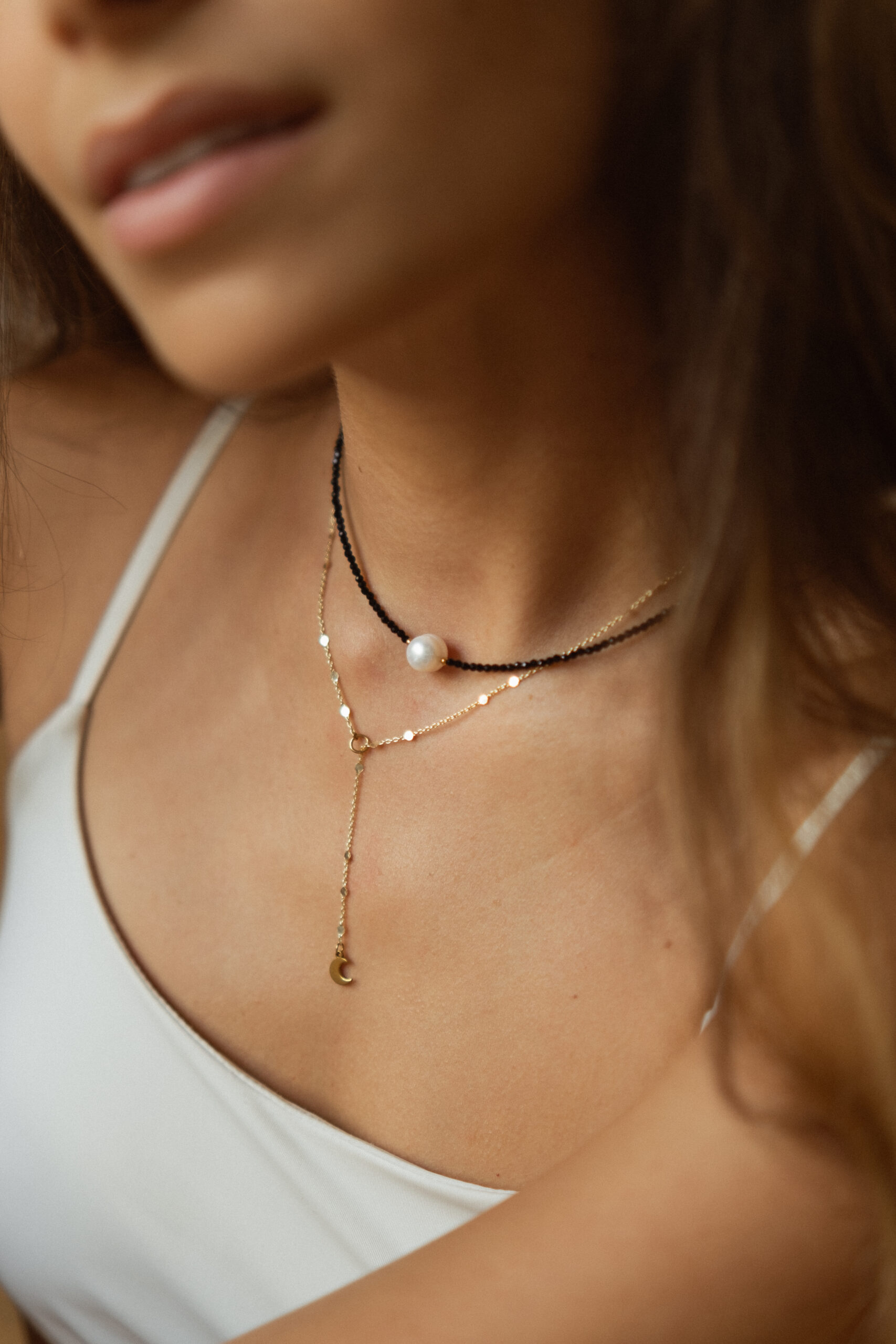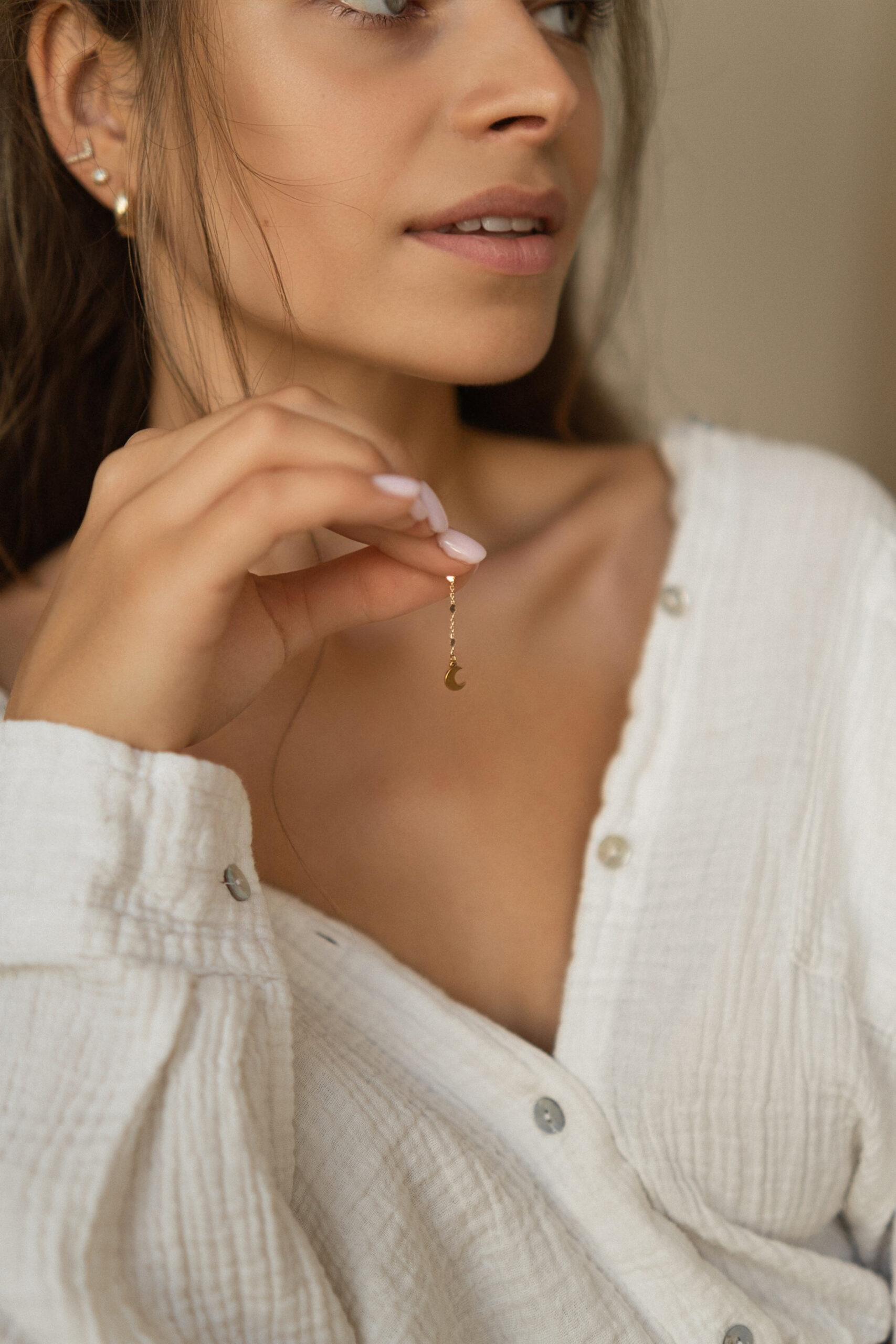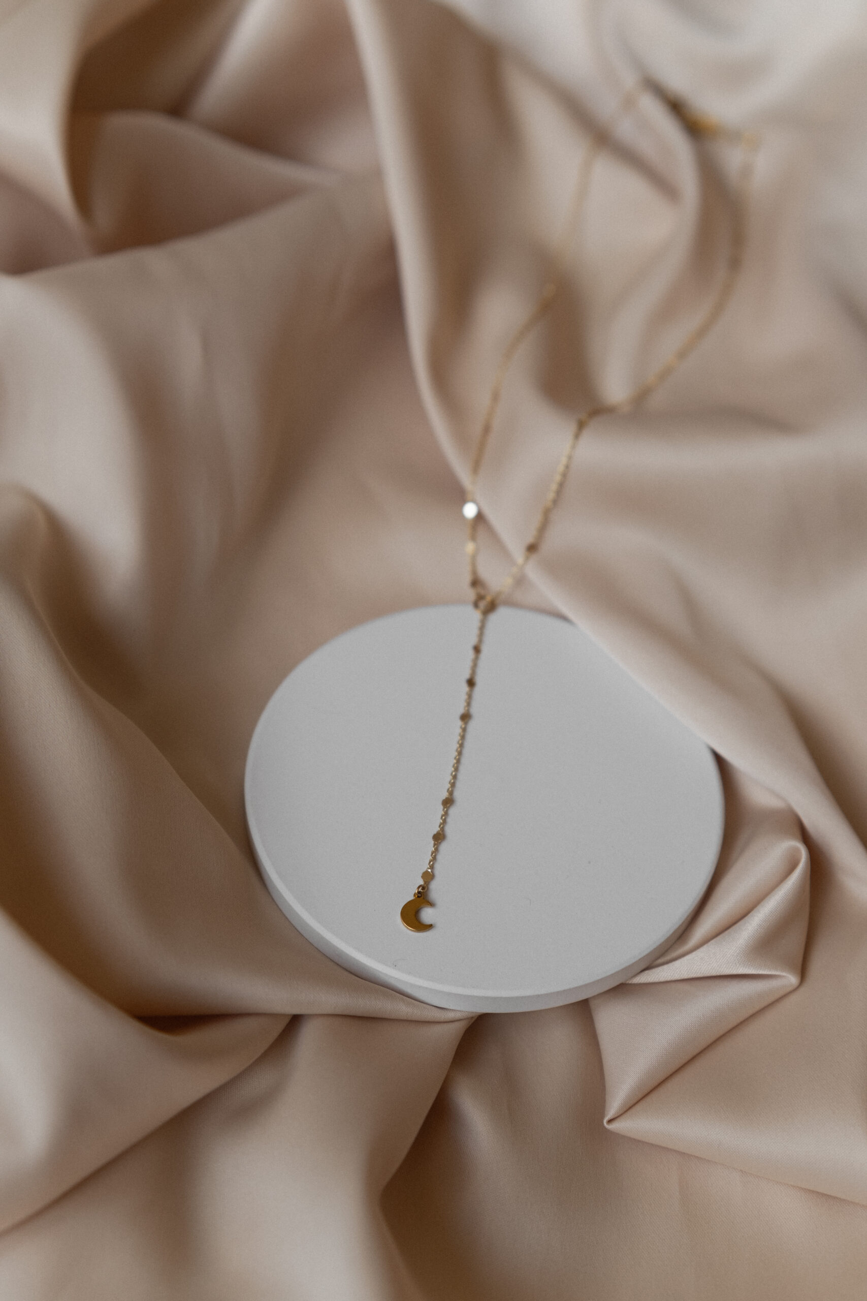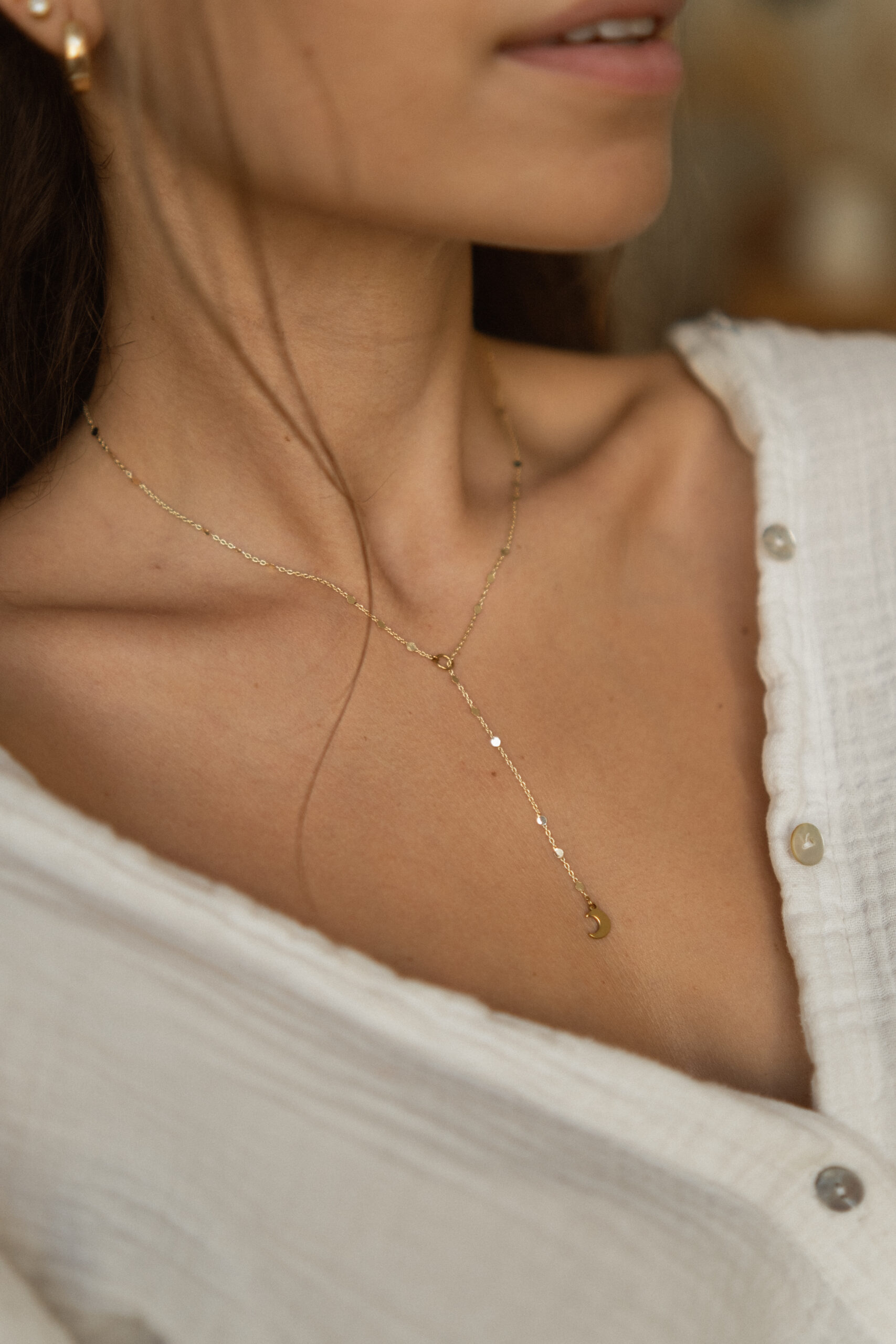 Minimalistický náhrdelník s mesiačikom. Náhrdelník je na predĺženej pohyblivej retiazke.