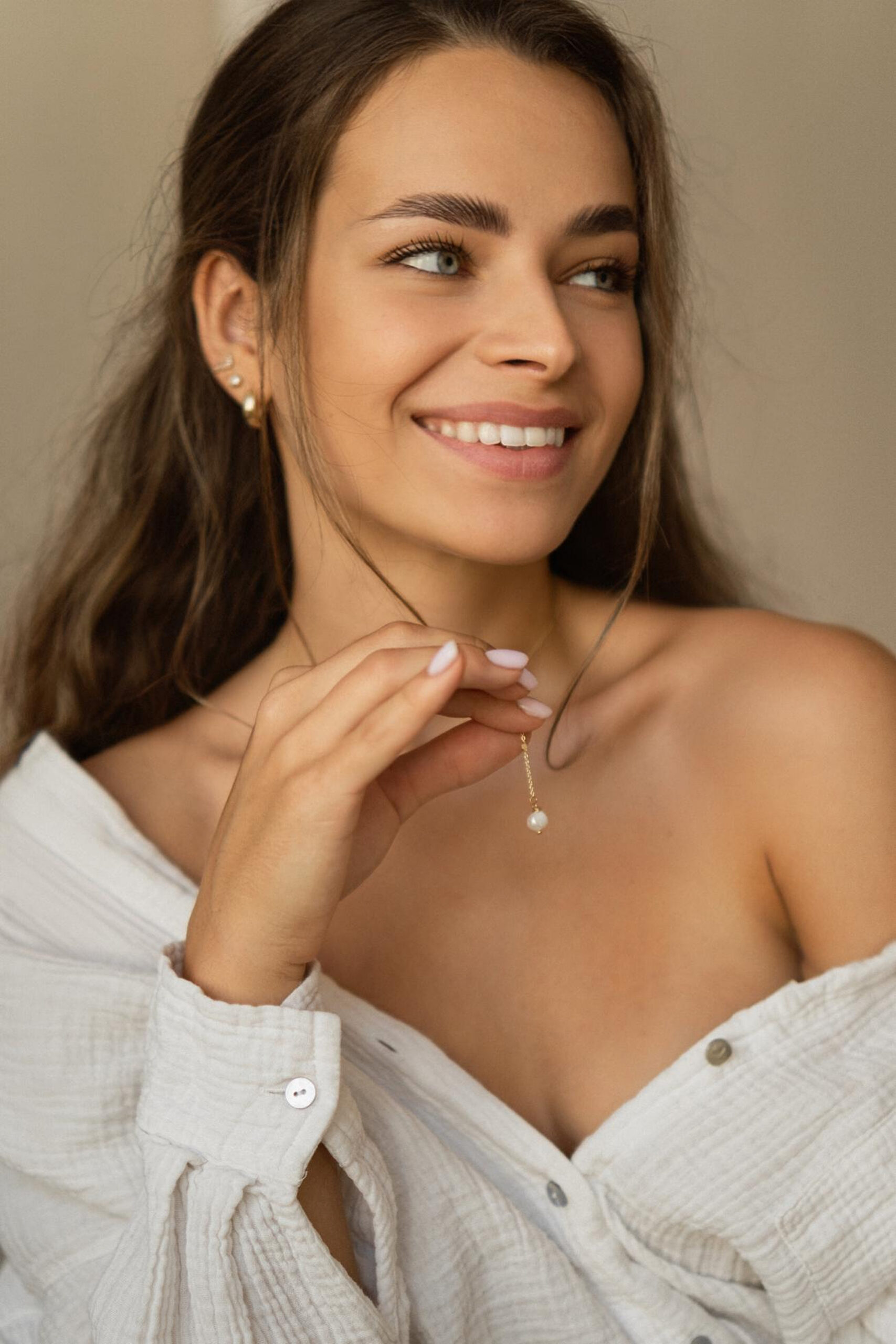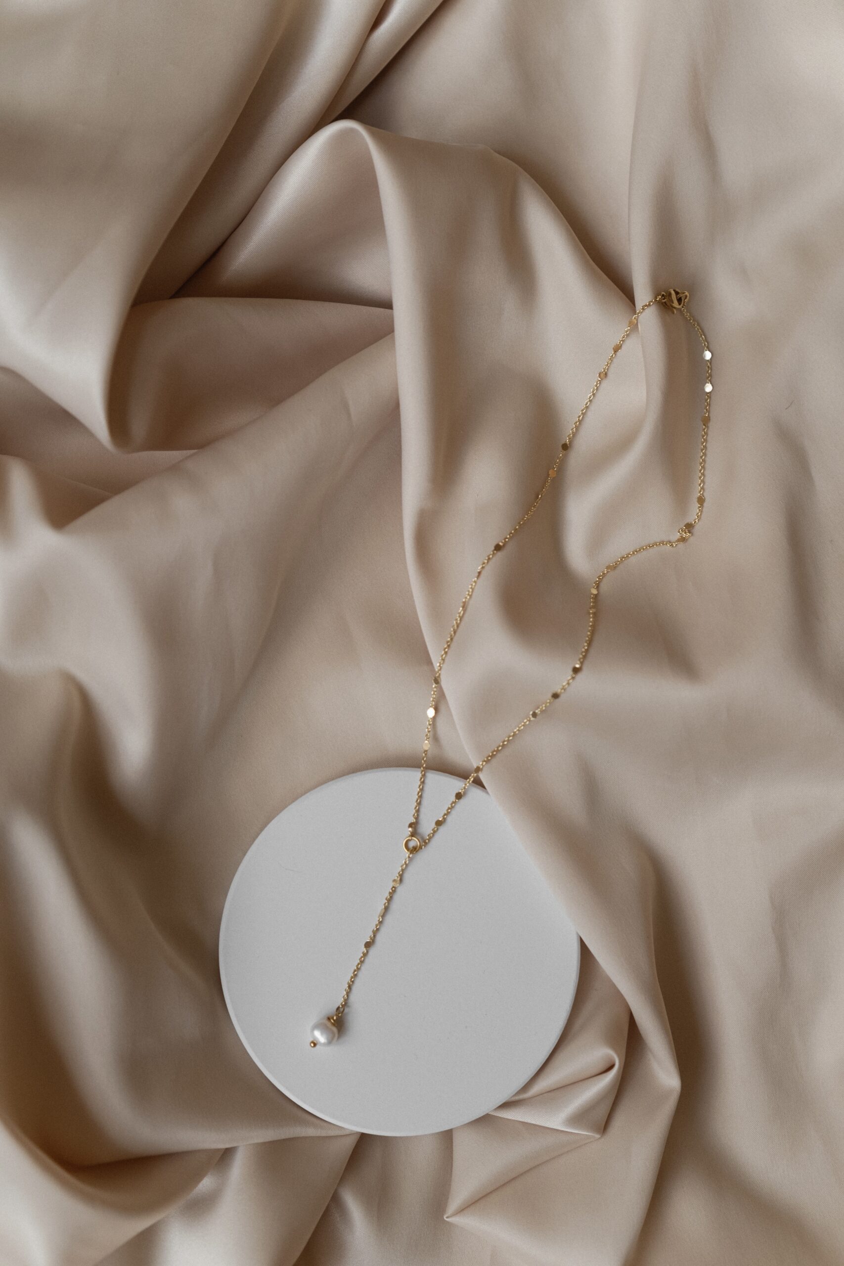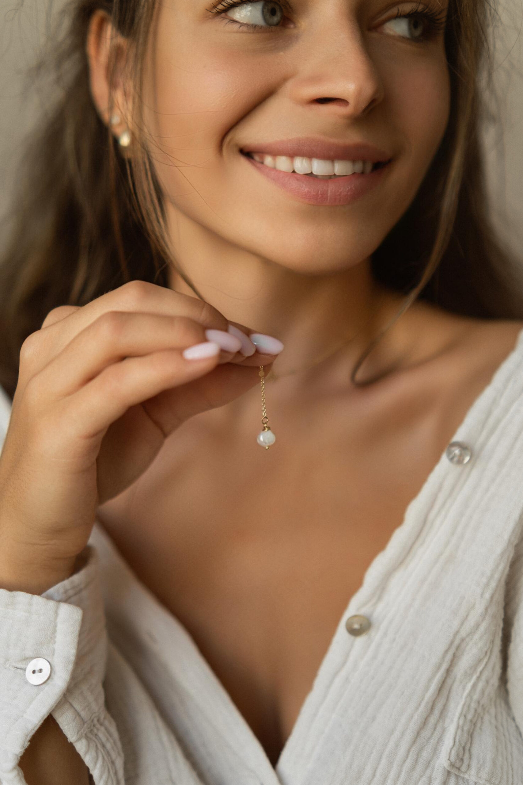 Minimalistický náhrdelník s riečnou perlou. Náhrdelník je na predĺženej pohyblivej retiazke. Dĺžka náhrdelníka je 38cm + 12cm predĺženie. (Ak si želáte inú dĺžku náhrdelníka, napíšte nám to prosím do poznámky pri objednávke).