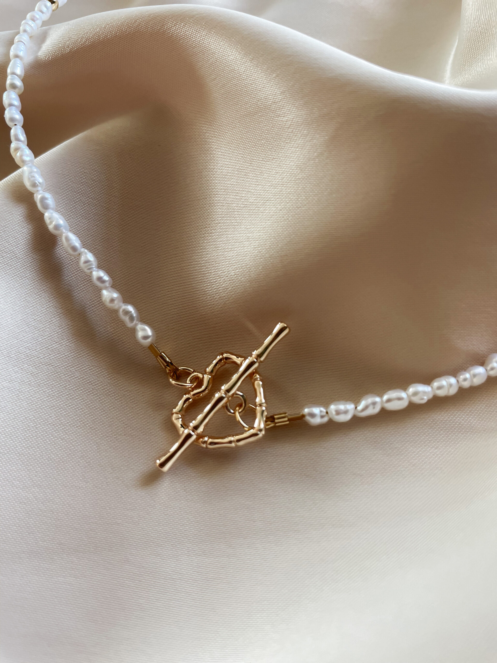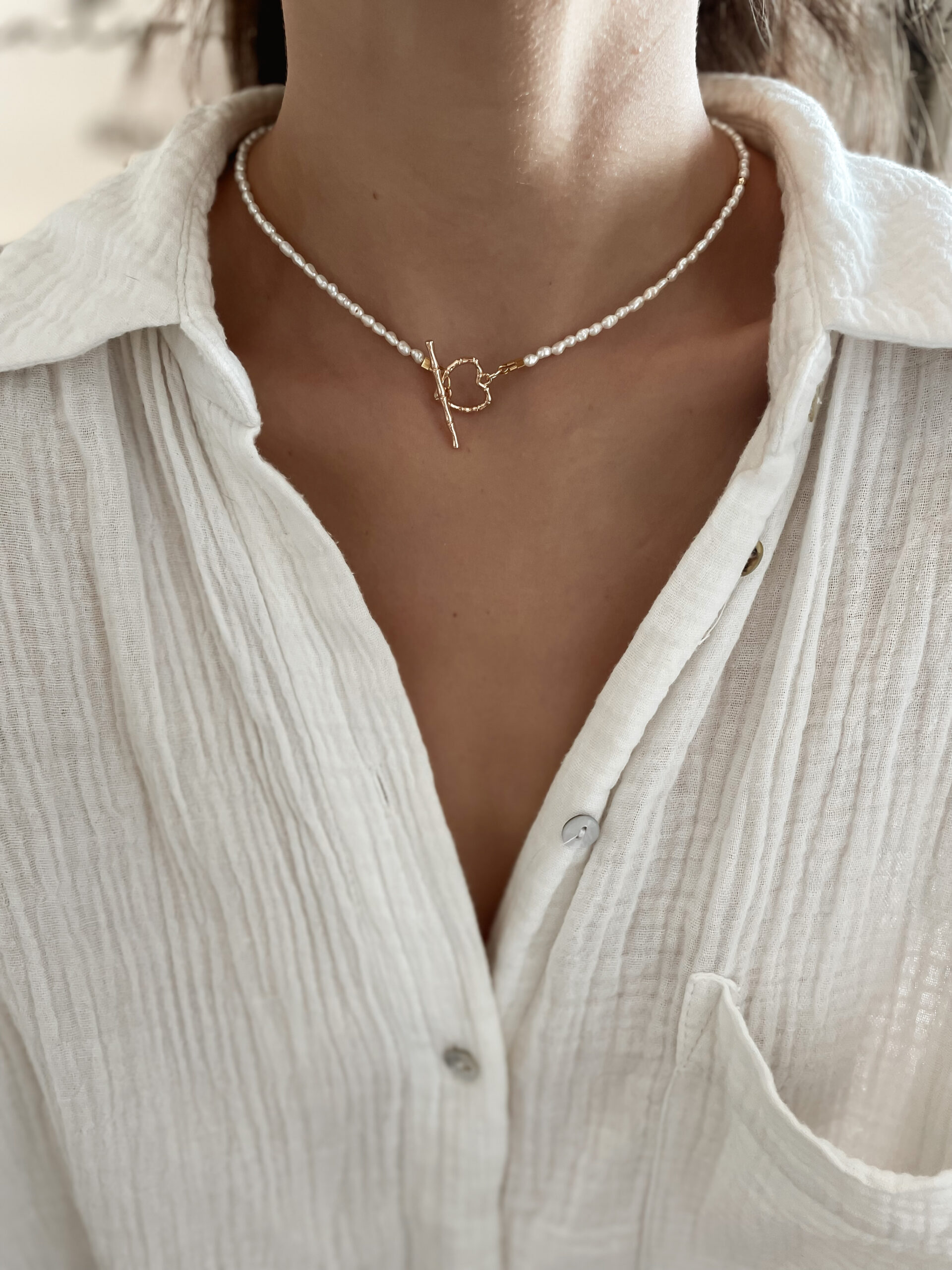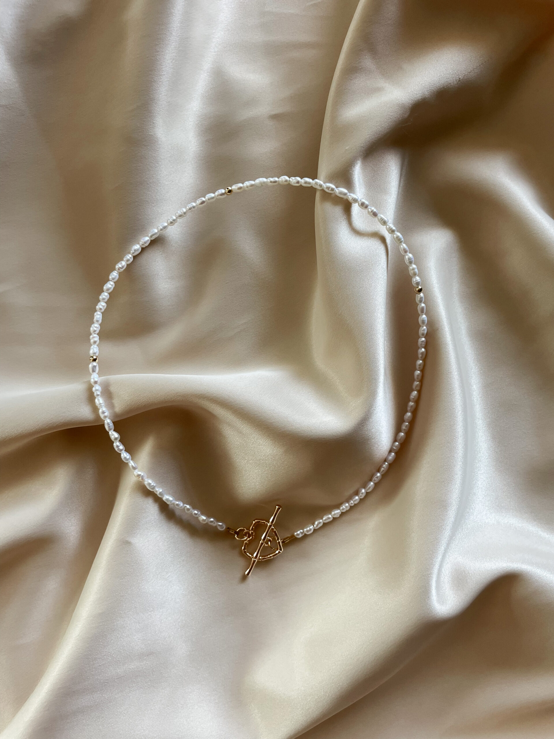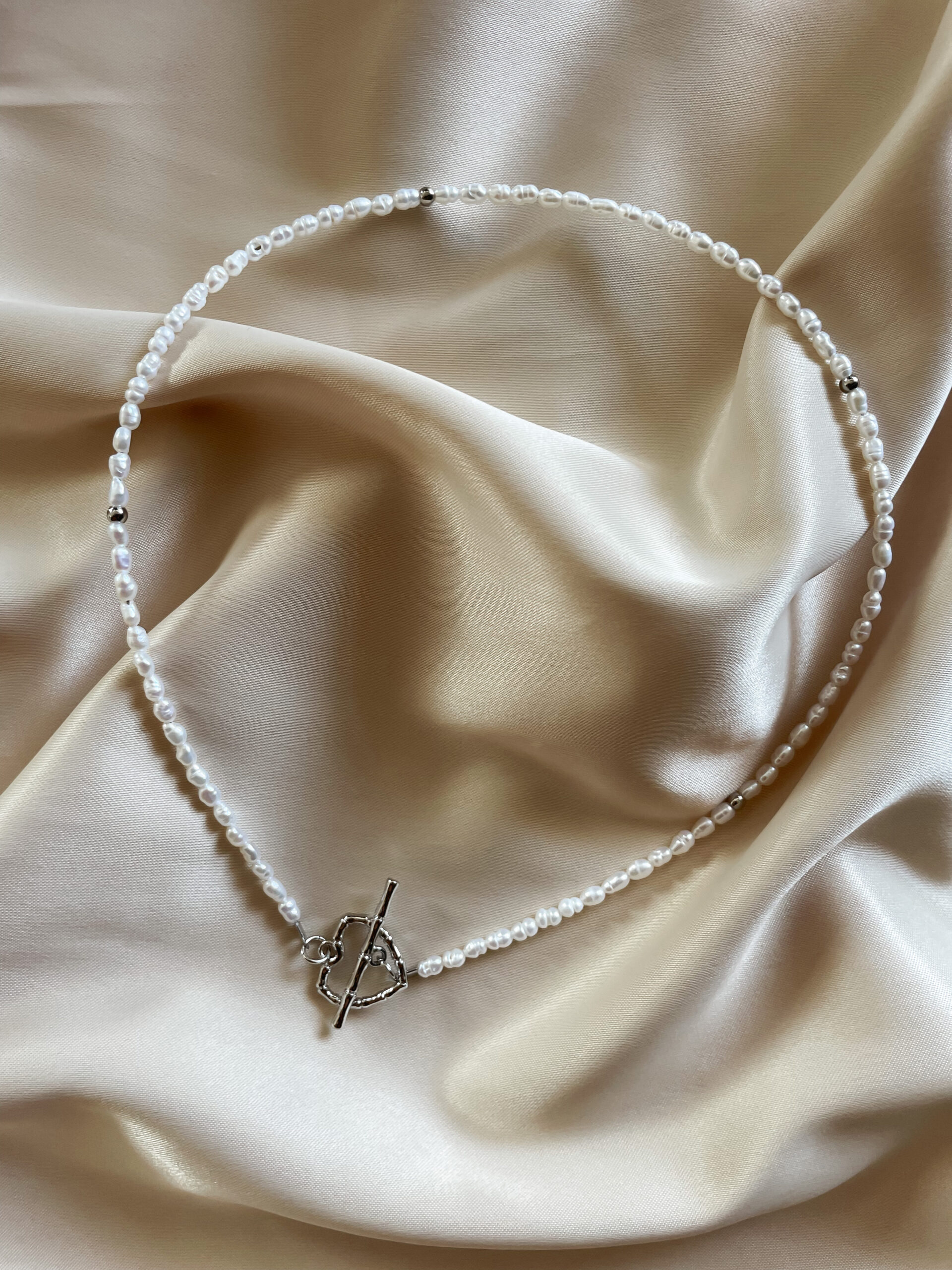 Minimalistický náhrdelník z mini riečnych perál a ozdobným srdiečkovým zapínaním. Štandartná dĺžka náhrdelníka je 38cm.
