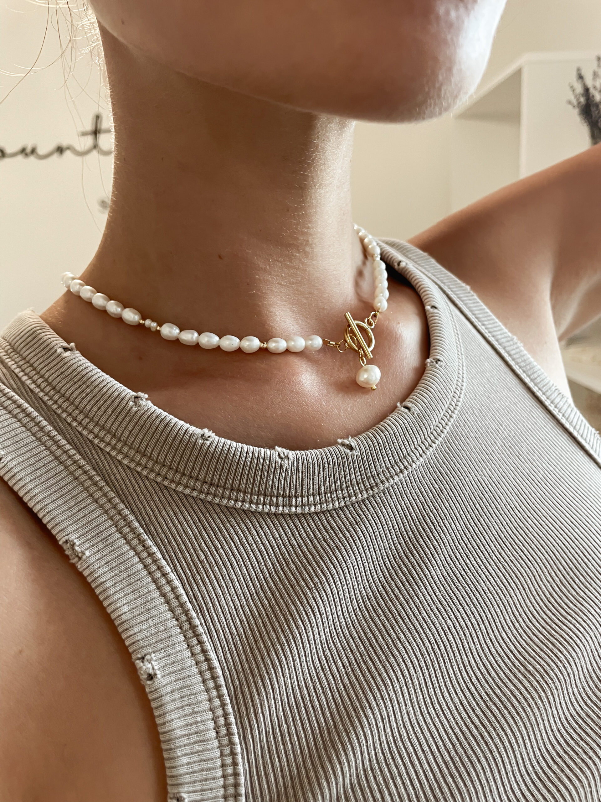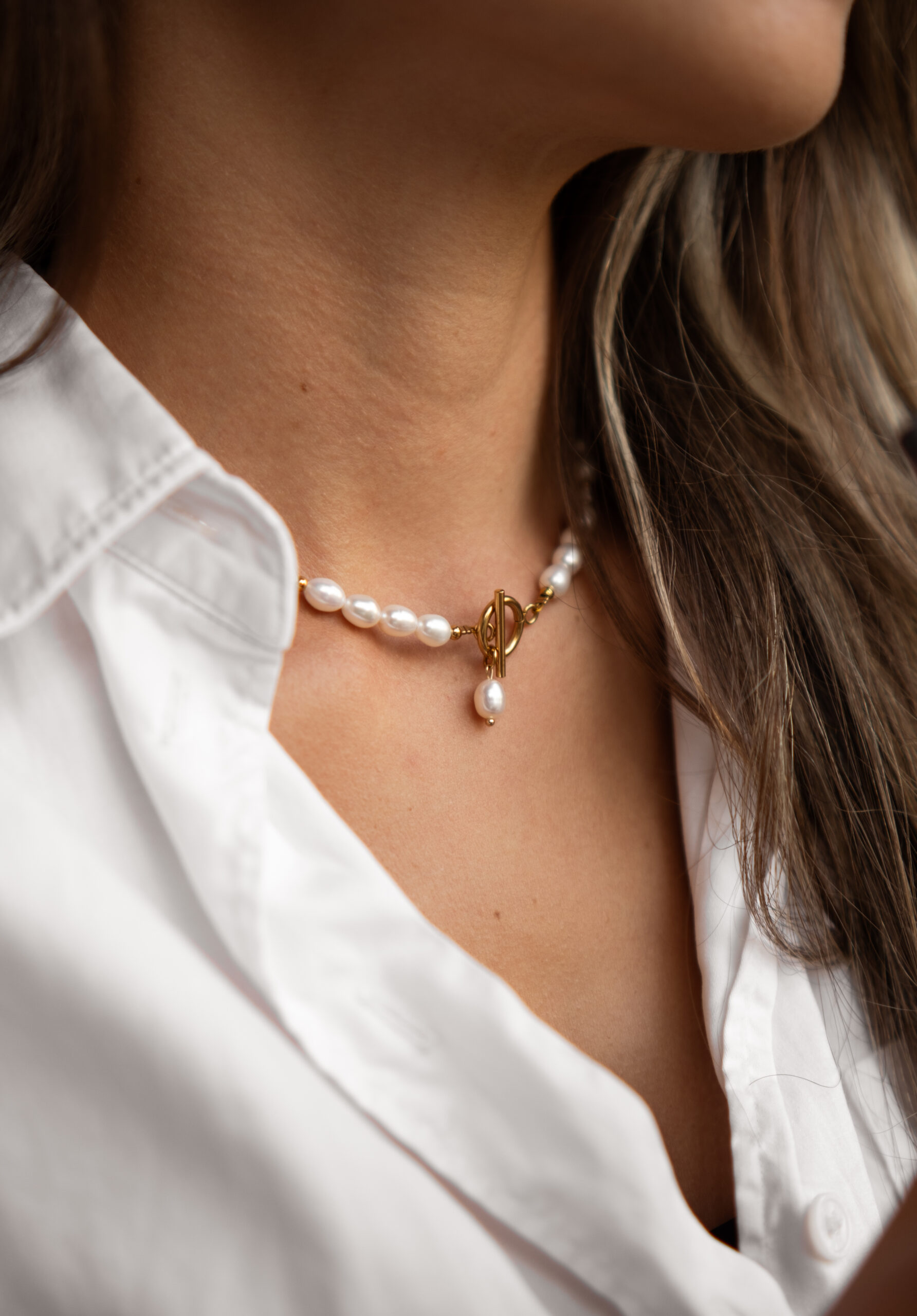 Exkluzívny náhrdelník s paličkovym zapínaním a riečnou perlou. Štandartná dĺžka náhrdelníka je 38cm.