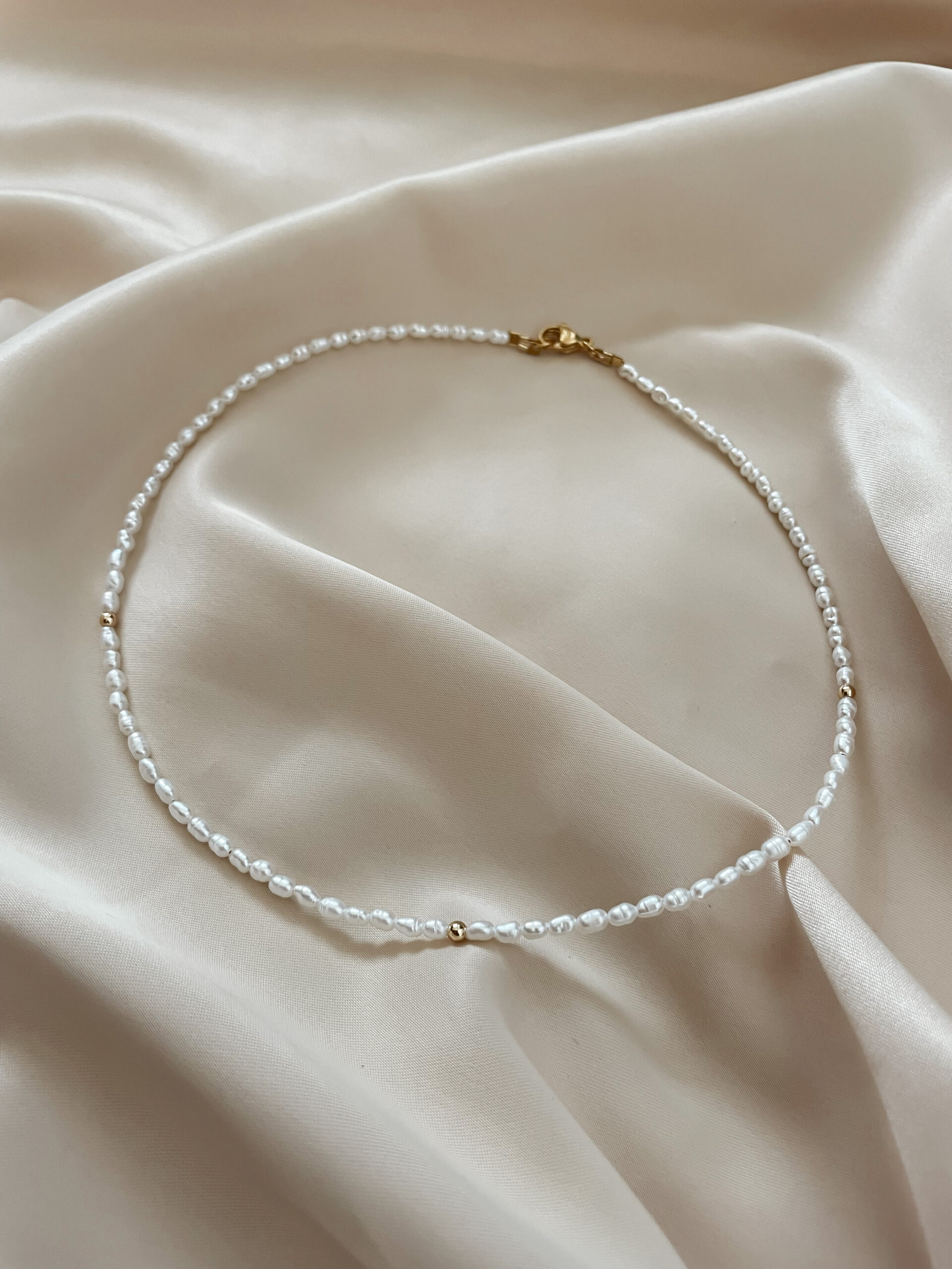 Minimalistický náhrdelník z mini riečnych perál. Štadartná dĺžka náhrdelníka je 38cm.