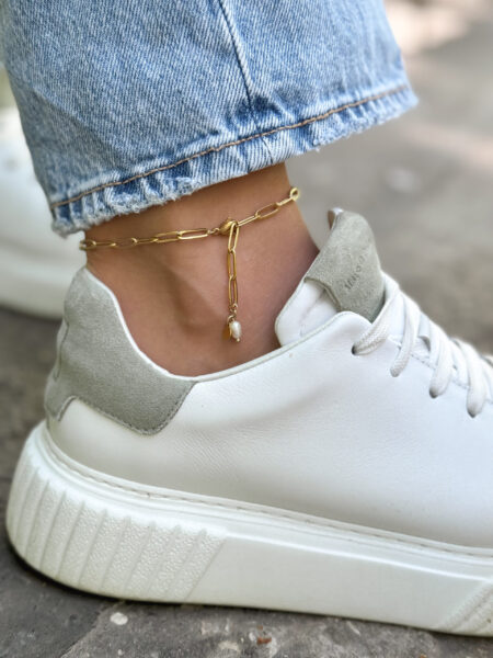 Minimalistický náramok na nohu s regulovateľným zapínaním a riečnou perlou.