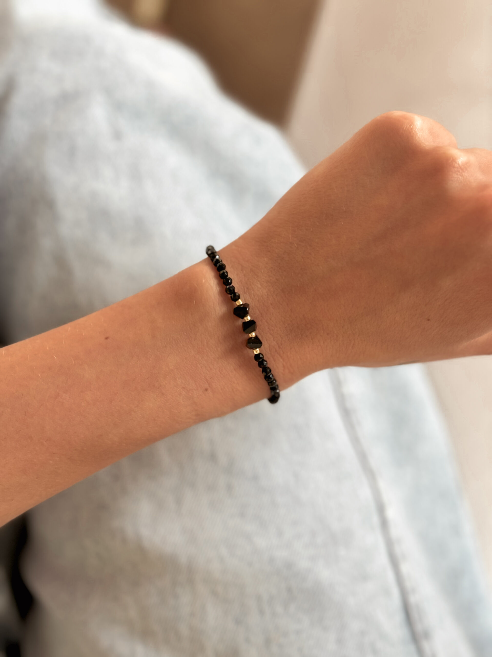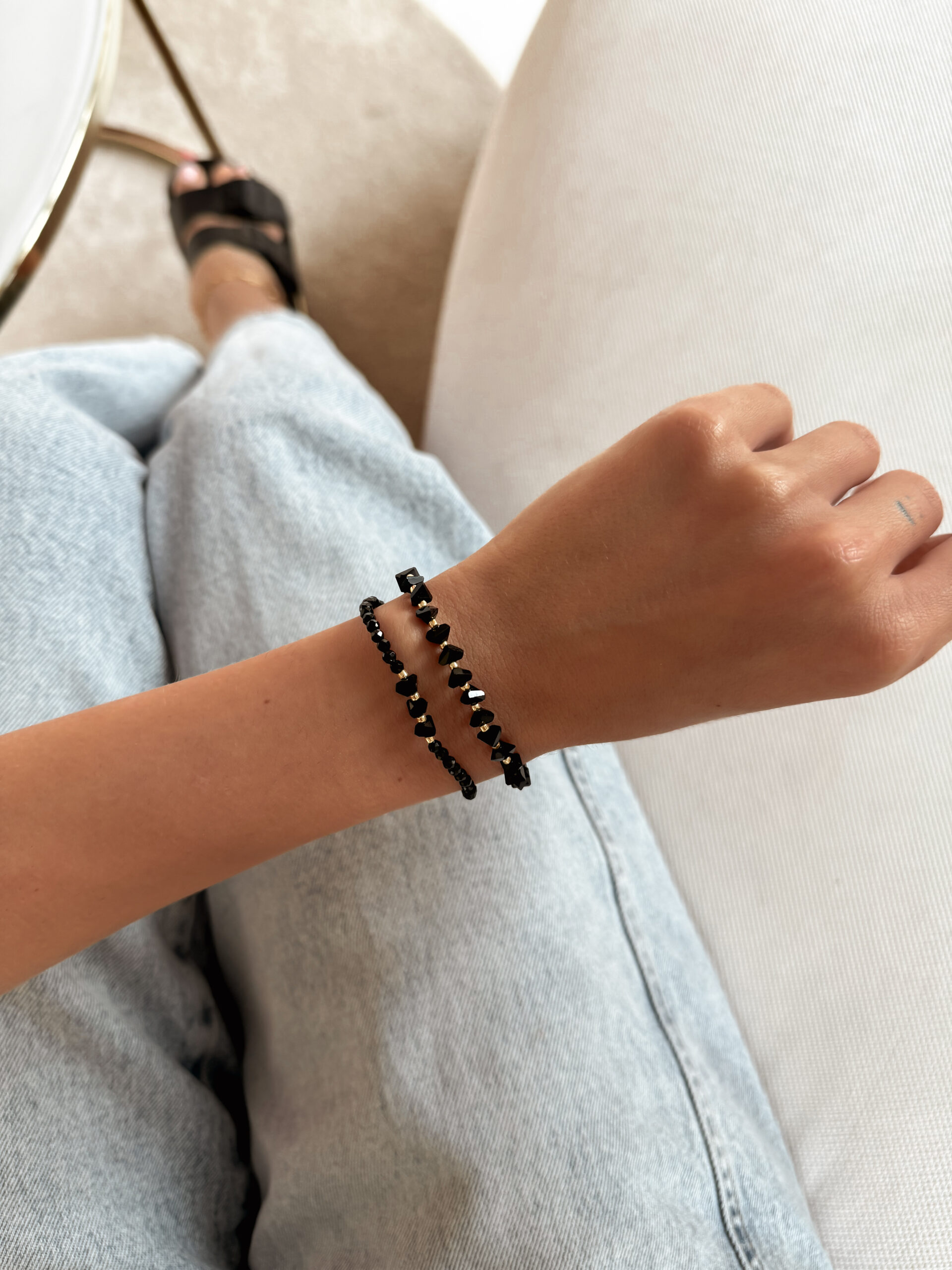 Minimalistické náramky na ruku zo sekaných kryštálov onyxu. Náramok je na gumičke.