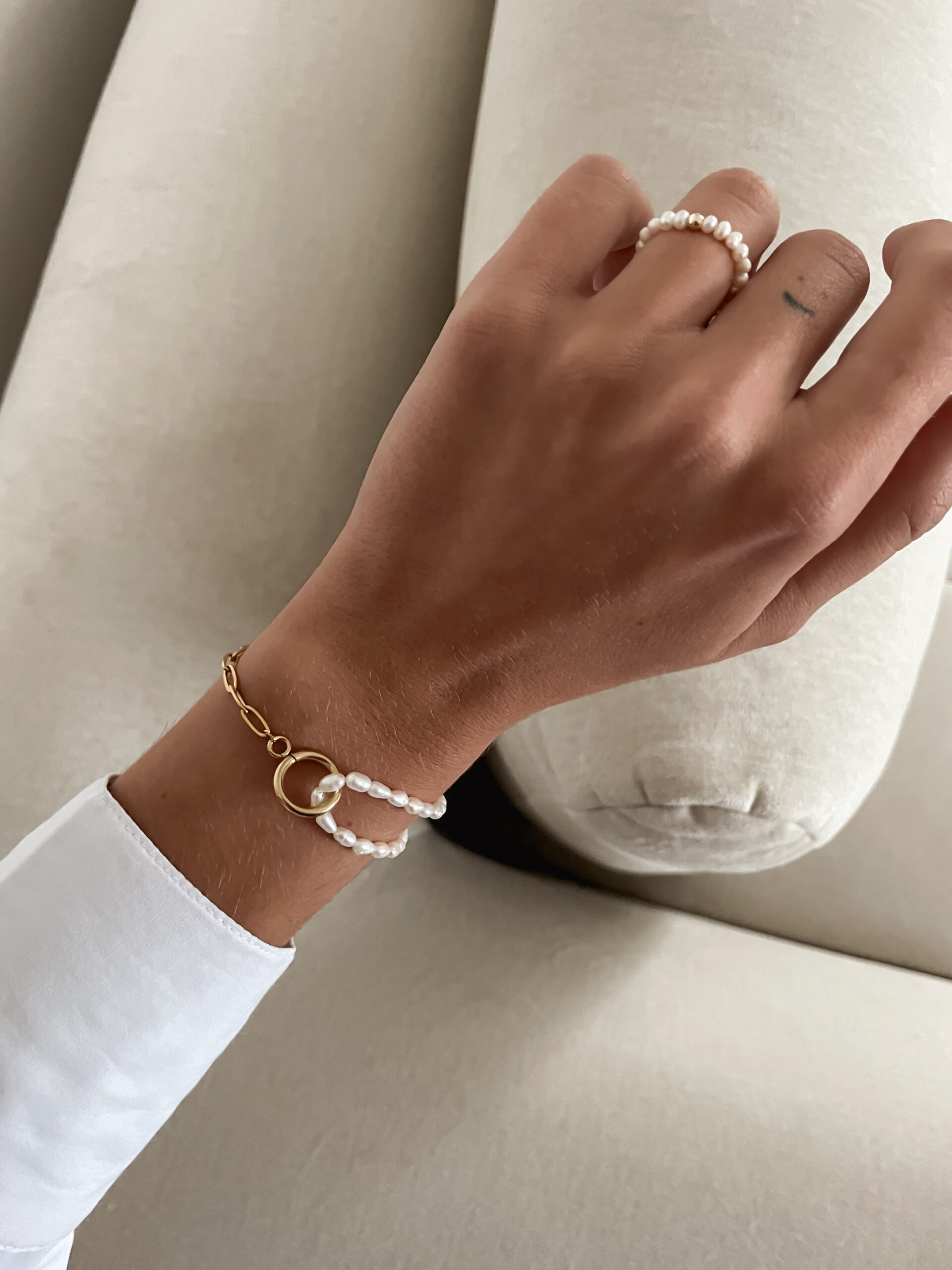 Popis produktu: Tento náramok je spojením prírodného pôvodu a moderného dizajnu. Skladá sa z nádherne lesklých riečnych perál, ktoré sú prepletené do kruhu a spojené s minimalistickou retiazkou z chirurgickej ocele. Výsledkom je šperk, ktorý zjednocuje prirodzenú krásu s eleganciou.