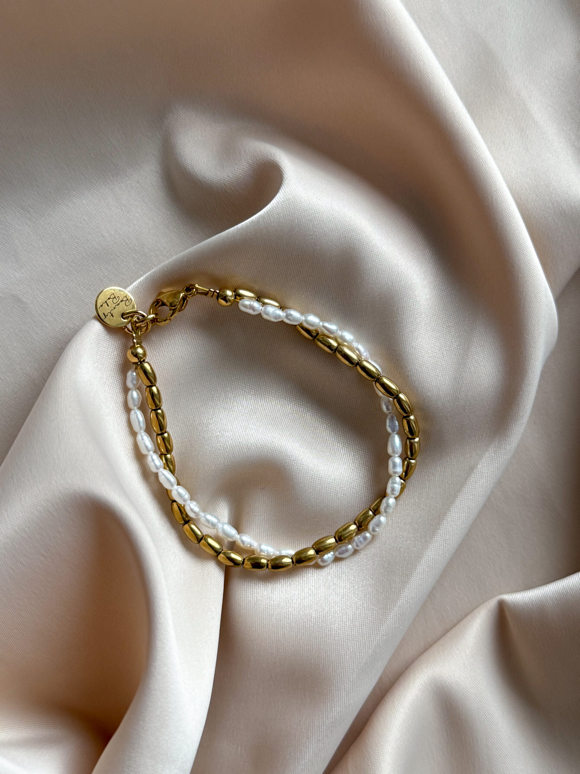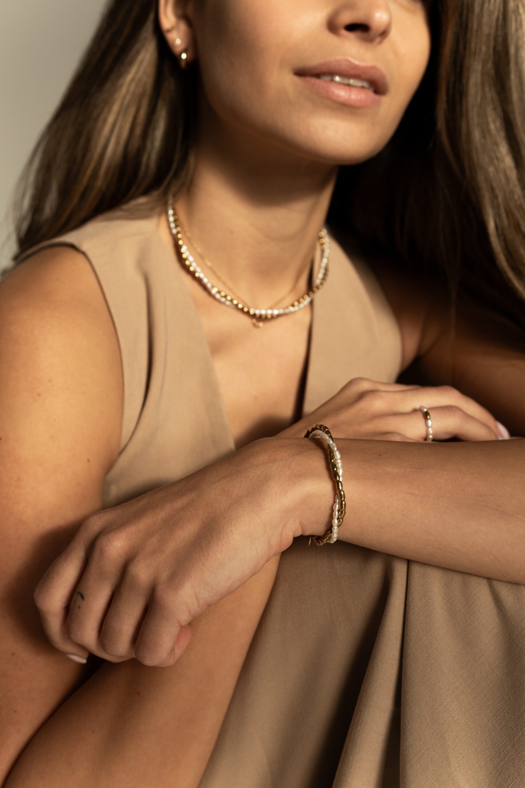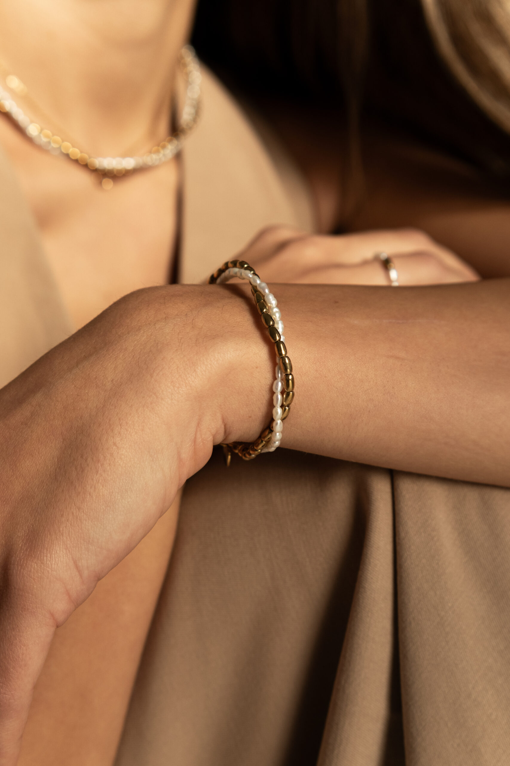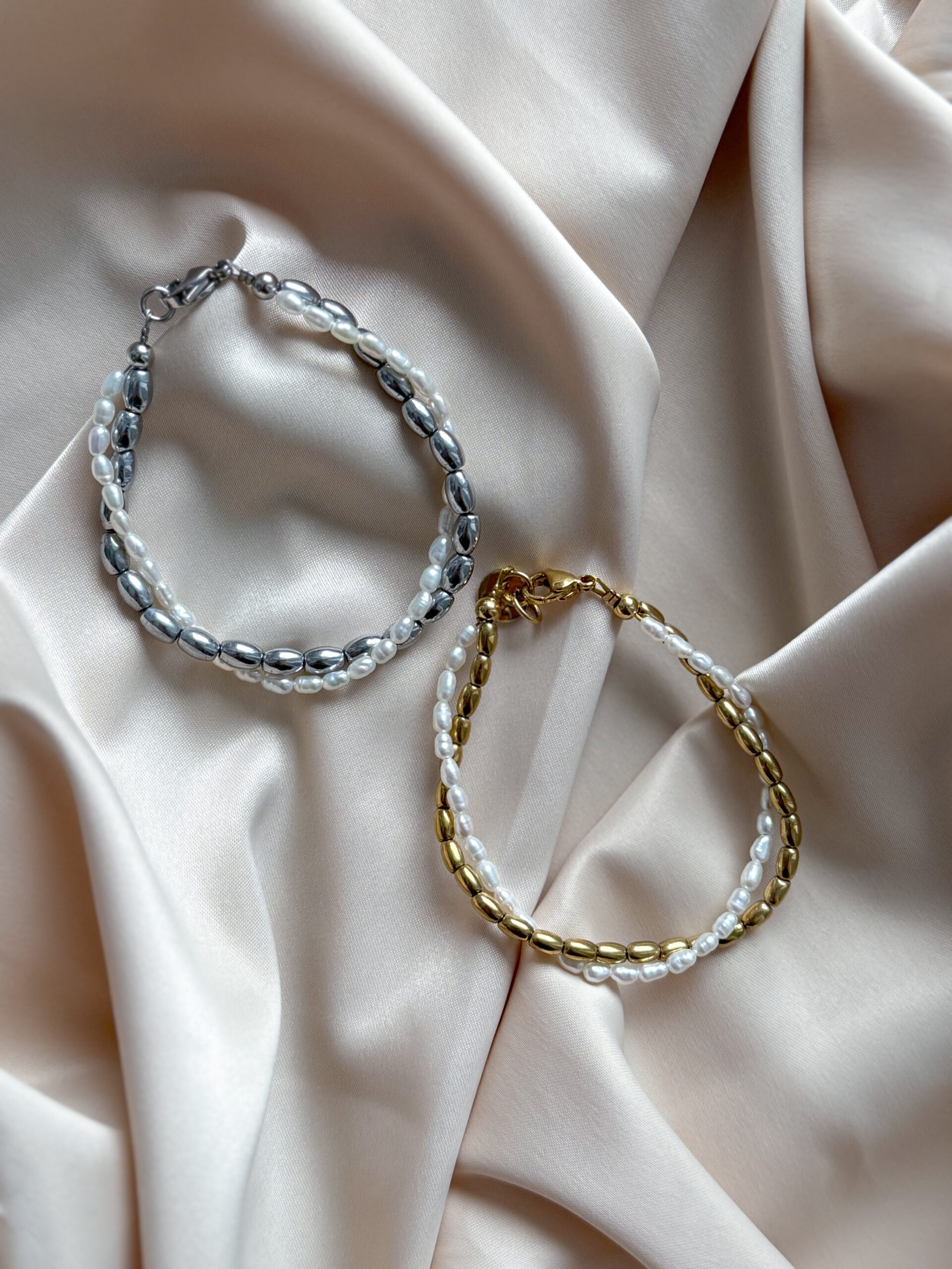Minimalistický preplietaný náramok z riečnych perál a hematitu.
