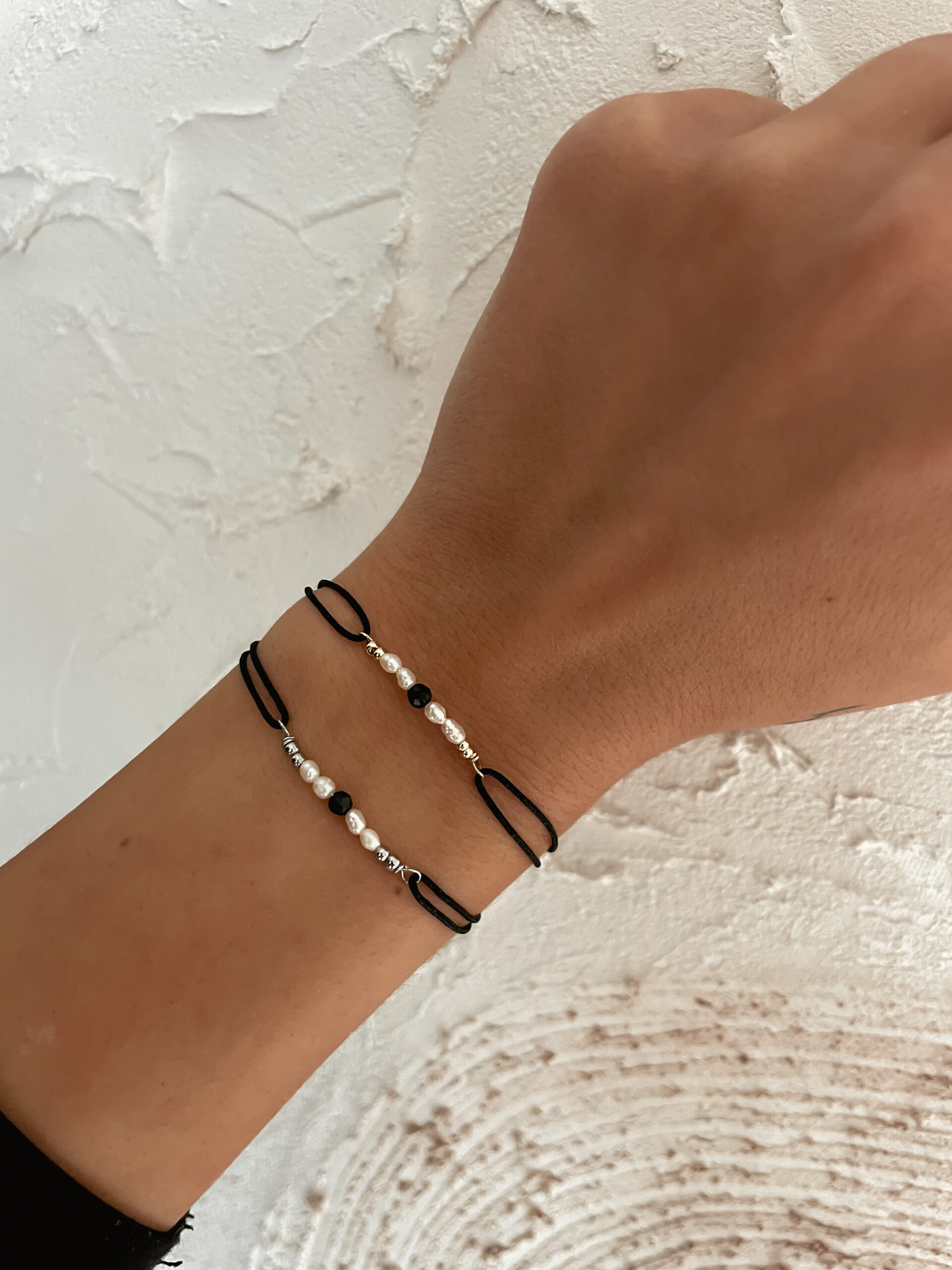 Minimalistický náramok na ruku na saténovej šnúrke s riečnymi perlami a onyxom. Veľkosť náramku je nastaviteľná na uzlíkoch.